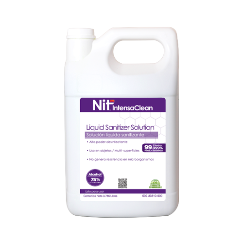NIT Liquid Sanitizer Solution es un desinfectante cuya formulación tiene como base alcohol. Se utiliza para la desinfección de superficies tales como: mesas, equipos e instrumentos (excepto en instrumentos, materiales y equipo biomédico) elementos de cocina, etc. Está diseñado para favorecer las condiciones de inocuidad en distintos tipos de ambiente.