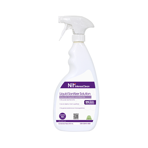 NIT Liquid Sanitizer Solution es un desinfectante cuya formulación tiene como base alcohol. Se utiliza para la desinfección de superficies tales como: mesas, equipos e instrumentos (excepto en instrumentos, materiales y equipo biomédico) elementos de cocina, etc. Está diseñado para favorecer las condiciones de inocuidad en distintos tipos de ambiente.