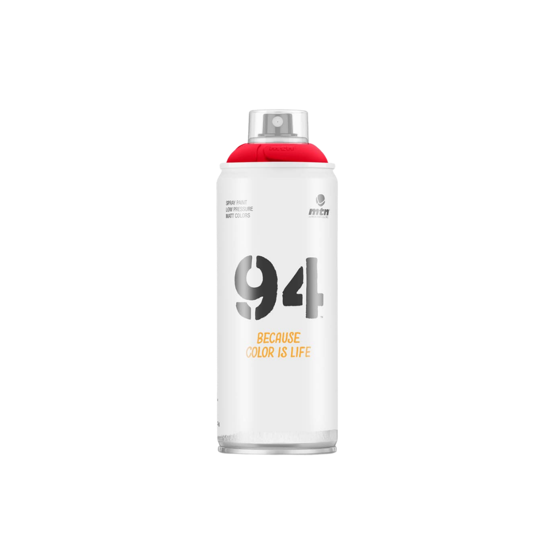 Spray de pintura mate MTN 94 color rojo vivo: alta cubrición, secado rápido y resistencia UV, ideal para arte, graffiti, muralismo y bricolaje profesional.