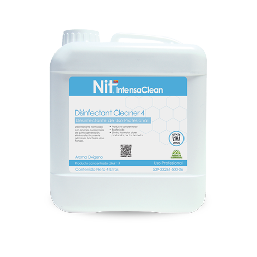 NIT Intensaclean Disinfectant-Cleaner 4 Oxy es un desinfectante limpiador concentrado de grado institucional y profesional diseñado para ofrecer desinfección eficaz y limpieza profunda en superficies duras no porosas. Combina tres principios activos (aldehídos, alcoholes y amonios cuaternarios de quinta generación) que actúan en sinergia para eliminar microorganismos y neutralizar los malos olores bacterianos en lugar de enmascararlos.