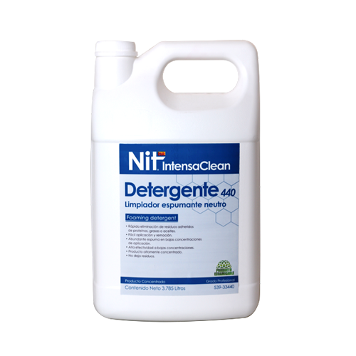 DETERGENTE 440 LIMPIADOR ESPUMANTE NEUTRO es altamente concentrado, especial para la remoción de restos de alimentos, proteínas, grasas o aceites. Su fórmula incluye tensoactivos, detergentes e ingredientes que ayudan a desincrustar minerales de forma superficial, para lograr inocuidad en diferentes procesos industriales y en la entrada a plantas de producción. Producto neutro, sin fragancia ni color.