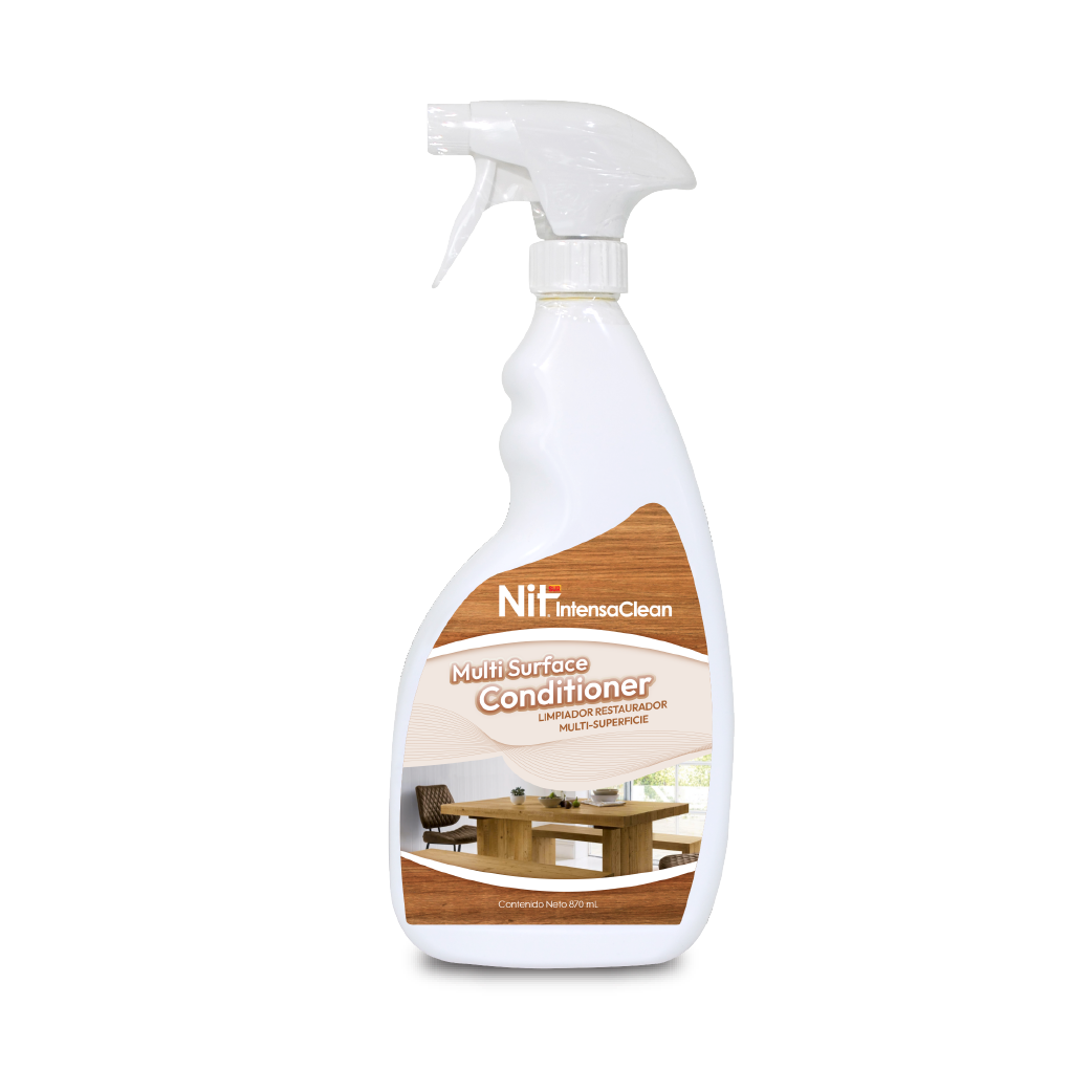 NIT IntensaClean Multi Surface Conditioner es un acondicionador con siliconas no volátiles, diseñado para restaurar y proteger múltiples superficies como vinilo, plástico, hule, madera tratada. A diferencia de productos similares, no deja una superficie grasosa o excesivamente brillante, sino un elegante acabado satinado.