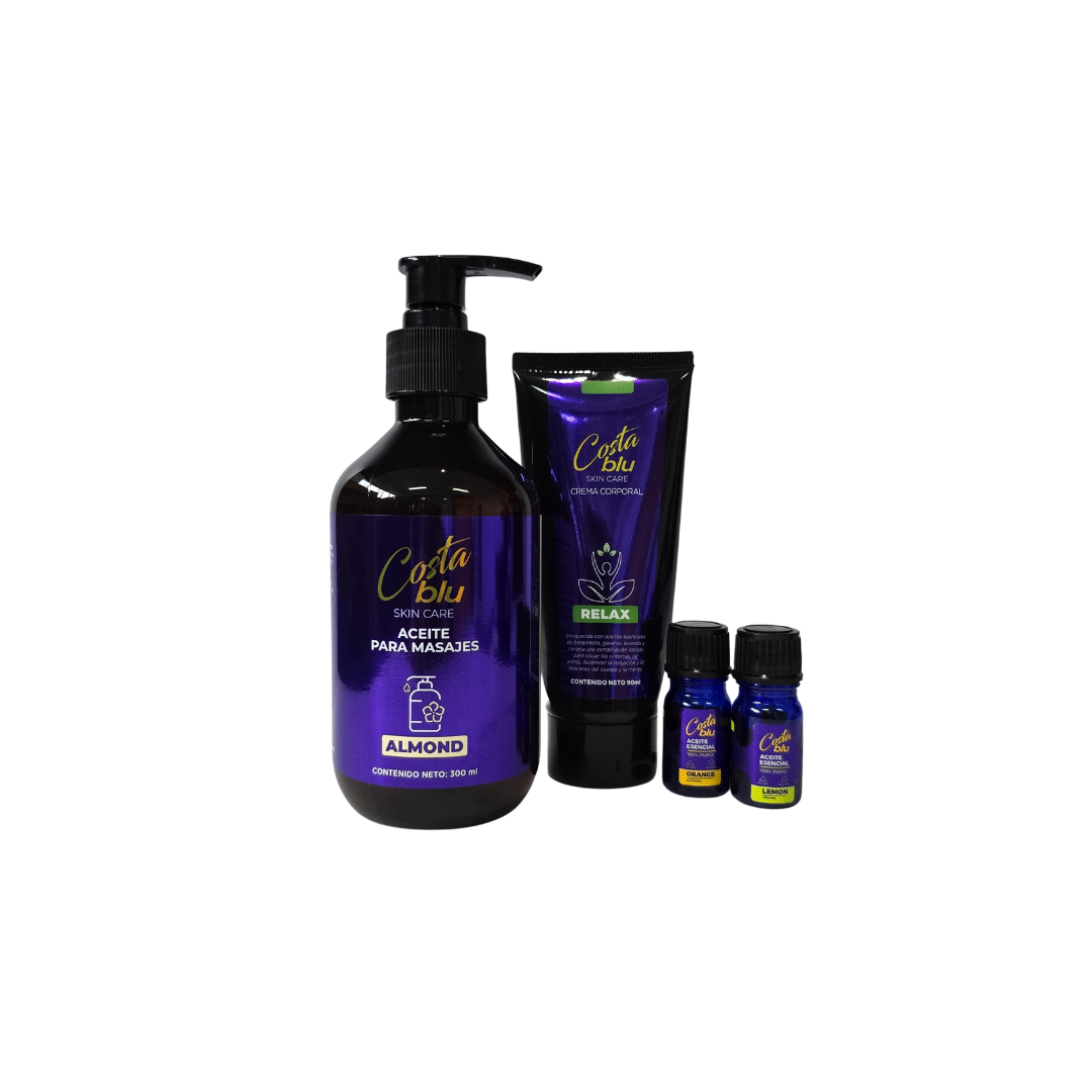 El Kit Costa blu Ritual Almendras ofrece nutrición y suavidad en una rutina completa. Incluye dos aceites aromáticos de 5 ml, una crema corporal de 90 ml y aceite de almendras para hidratar y cuidar tu piel cada día. (KIT CB ACEITE DE ALMENDRAS)