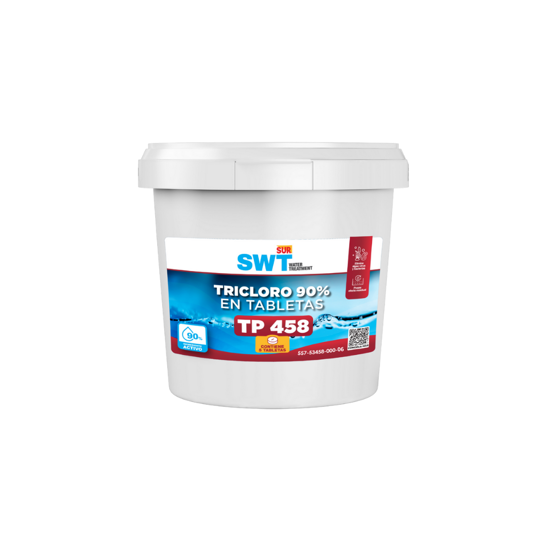 TRICLORO 90% EN TABLETAS TP 458 es un producto en pastillas o tabletas, compuesto a base de ácido tricloroisocianúrico (ATCC), con una alta cantidad de cloro disponible. Posee un amplio espectro de efectividad que elimina algas, bacterias y virus. Su alto contenido de cloro disponible permite asegurar una dosis de cloro residual en el agua que ayuda a mantener las condiciones de higiene, dando un mayor rendimiento comparado con otros productos clorados.